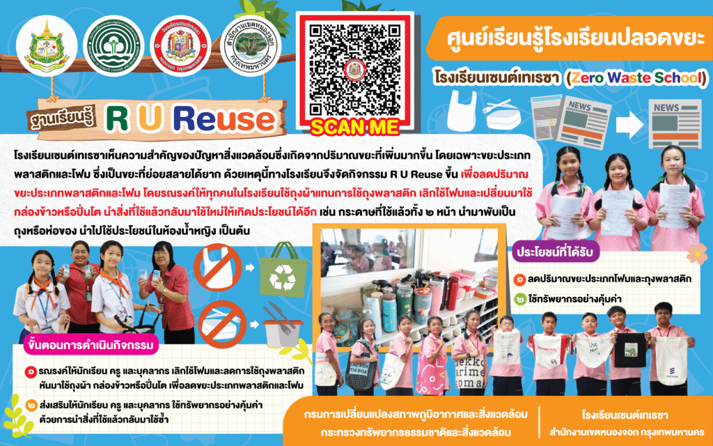 ลดปริมาณขยะประเภทพลาสติกและโฟม โดยรณรงค์ให้ทุกคนในโรงเรียนใช้ถุงผ้าแทนการใช้ถุงพลาสติก เลิกใช้โฟมและเปลี่ยนมาใช้กล่องข้าวหรือปิ่นโต นำสิ่งที่ใช้แล้วกลับมาใช้ใหม่ให้เกิดประโยชน์ได้อีก