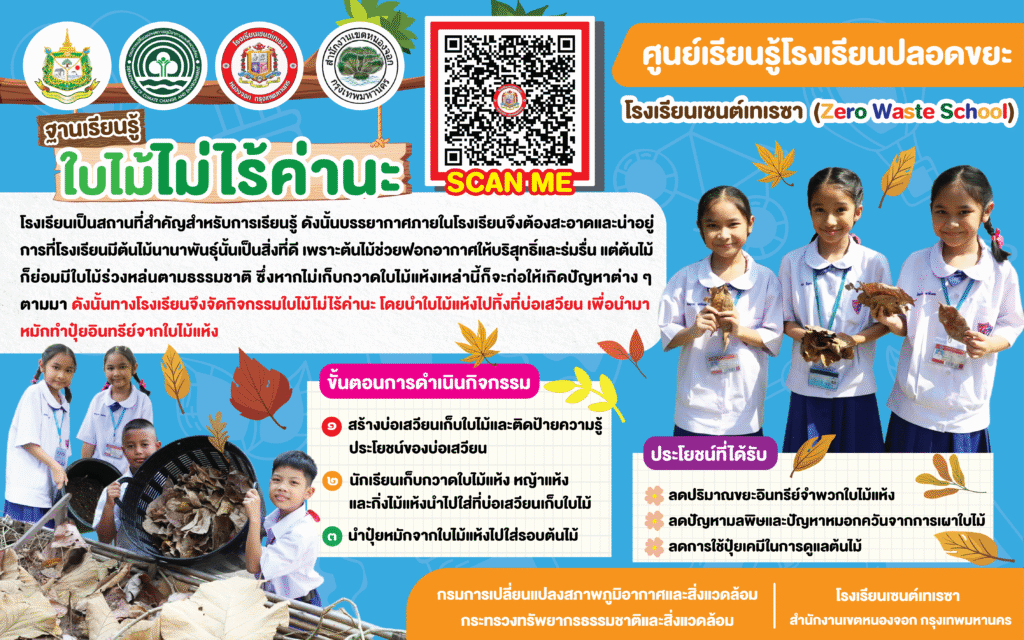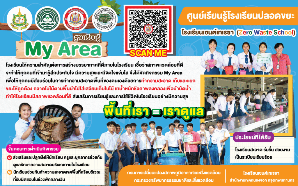 ทำความสะอาด เก็บและแยกขยะให้ถูกต้อง กวาดใบไม้ตามพื้นนำไปใส่เสวียนเก็บใบไม้ เทน้ำหมักชีวภาพลงคลองเพื่อบำบัดน้ำ ทำให้โรงเรียนมีสภาพแวดล้อมที่ดี