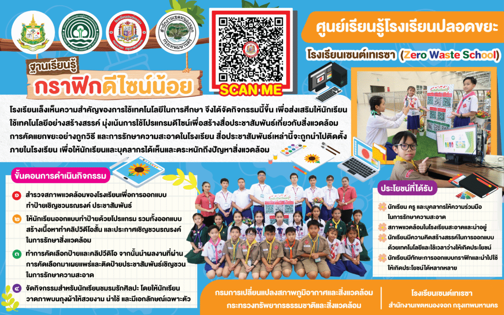 ใช้โปรแกรมดีไซต์ เพื่อสร้างสื่อประชาสัมพันธ์เกี่ยวกับสิ่งแวดล้อม การคัดแยกขยะอย่างถูกวิธี และการรักษาความสะอาดในโรงเรียน
