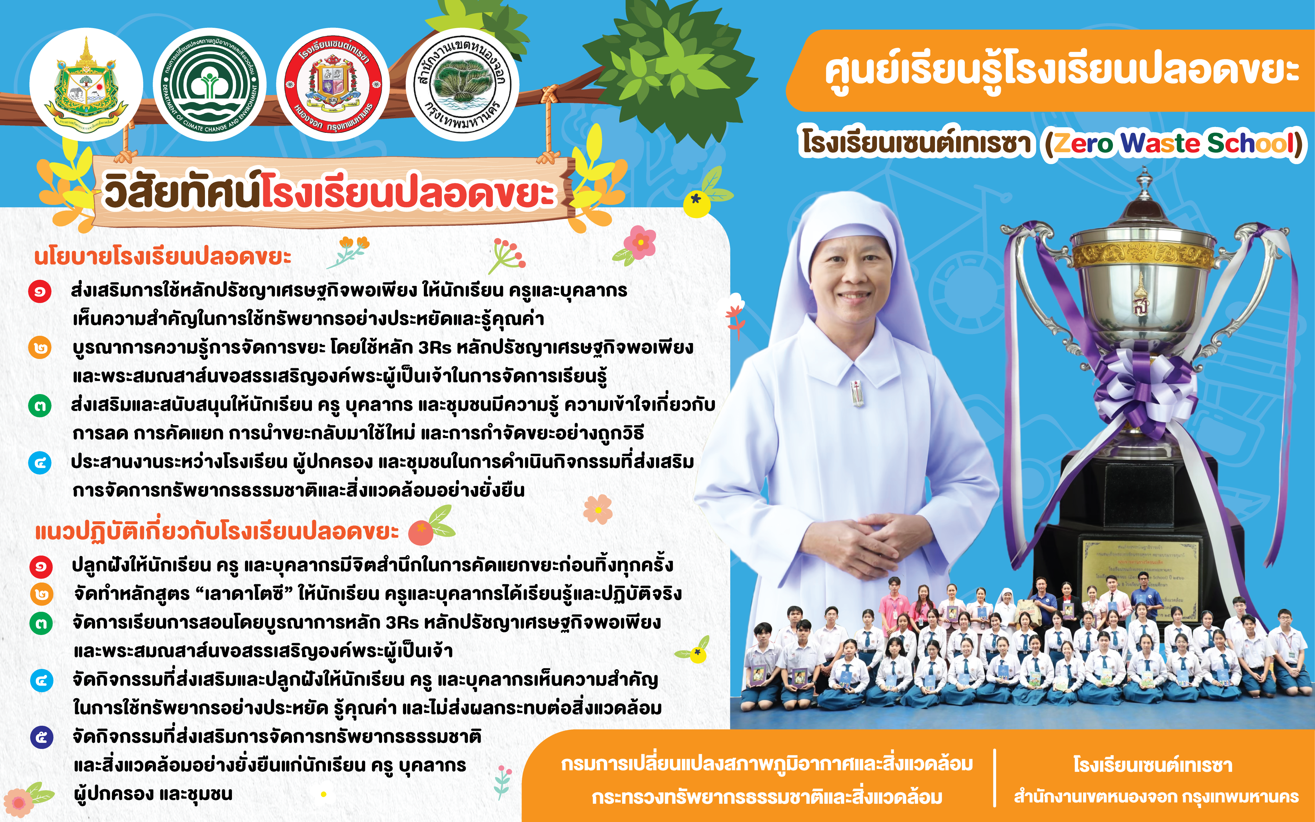 บริการงานแบบมีส่วนร่วม ดำเนินงานจัดการขยะด้วยหลัก 3Rs ใช้ทรัพยากรอย่างรู้ค่า พัฒนาสู่โรงเรียนปลอดขยะตามหลักปรัชญาเศรษฐกิจพอเพียงและพระสมณสาส์นขอสรรเสริญองค์พระผู้เป็นเจ้า